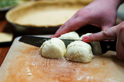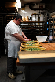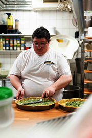 Um 6.45 Uhr, wenn die Bäcker in Denningers Mühlenbäckerei in der Berger Straße ihren Arbeitstag bereits hinter sich haben, legt Marc Mölkner mit seinem Tagwerk los: dem Herstellen knuspriger Gemüsetartes. "Spinat-Mozzarella und Zucchini-Mascarpone-Tarte gibt es das ganze Jahr über. Je nach Saison backen wir auch Rote-Beete-Bohnen-, Spargel- oder Kürbis-Lauch-Tartes", erklärt der junge Backstubenhelfer.