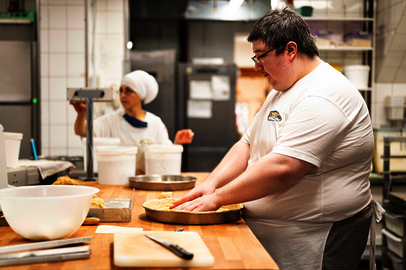 Für Klaus Denninger, Inhaber der Mühlenbäckerei, hörte sich das Konzept der Unterstützten Beschäftigung interessant an. "Marc hat erst ein Praktikum bei uns gemacht", sagt Denninger. "Wir haben gemerkt, dass er bei uns im Team gut zurechtkommt." Am Ende steht für Denninger fest, dass sein junger Backstubenhelfer die Qualifizierungsphase machen kann. Dafür bekommt er einen eigenständigen Arbeitsbereich. "Im Gespräch mit Herrn Strickstrock sind wir bei den Tartes gelandet", sagt Denninger.