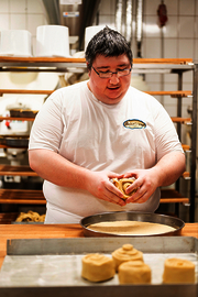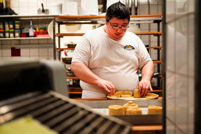 Marc Mölkner, dessen Vater selbst Bäcker ist, wusste schon als Kind, dass er gern in einer Bäckerei arbeiten möchte. Aufgrund seiner Schwerbehinderung fielen ihm Schule und Ausbildung aber nicht leicht: "Fachmathematik war wichtig, das konnte ich nicht gut. Die Theorieprüfung habe ich am Ende nicht bestanden." Die Begeisterung fürs Backen, Sorgfalt, Genauigkeit, Lernbereitschaft und körperliche Belastbarkeit – diese Voraussetzungen bringt der junge Mann für den Beruf aber mit.