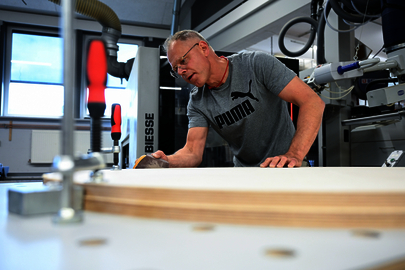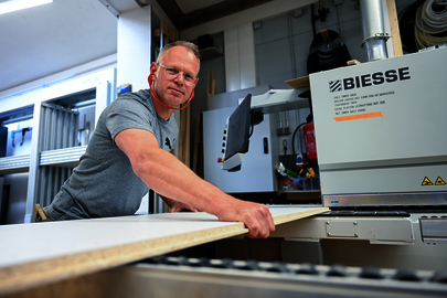 Bei seiner täglichen Arbeit merkt man Thorsten Werner fast nichts von seiner Behinderung an. Dennoch sind die körperlich anstrengenden Tätigkeiten, die in einer Tischlerei anfallen, eine Herausforderung für ihn. Die neuen Maschinen und Hilfsmittel, die der Betrieb jetzt mithilfe von Zuschüssen des LWV Hessen Integrationsamtes angeschafft hat, erleichtern dem 55-Jährigen die Arbeit ungemein. Gemeinsam mit dem persönlichen Ansprechpartner, Nils Görner, und dem fachlichen Berater, Wolfgang Holzki, des LWV Hessen Integrationsamtes wurden individuelle Lösungen erarbeitet, um den Arbeitsplatz des Thorsten Werner behinderungsgerecht zu gestalten. Ein elektrisch höhenverstellbarer Arbeitstisch gehört ebenso zu den Neuerungen wie zwei Vakuum-Sauganlagen zum Heben und Bewegen schwerer Werkstücke. Die größte Anschaffung ist eine automatische Kantenanleimmaschine, die deutlich einfacher zu bedienen ist als ihr Vorgängermodell. Arbeitsschritte, bei denen vorher zwei Personen notwendig waren, kann Thorsten Werner nun allein und ohne großen Aufwand bewältigen. „Der Unterschied ist enorm", sagt er. Große Platten hebt er nun mit Leichtigkeit von einer Stelle zur anderen. Und auch das „Anfahren" von Werkstücken an die neue Maschine sei dank des mobilen Arbeitstischs ein Leichtes.